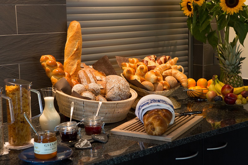 Mit Blick in die Bergwelt starten Sie genussvoll in den Tag – mit regionalen Spezialitäten und liebevoll ausgewählten Produkten beim Self-Service Frühstücksbuffet