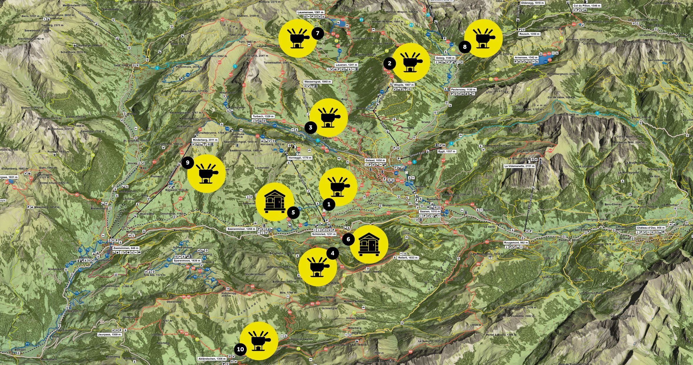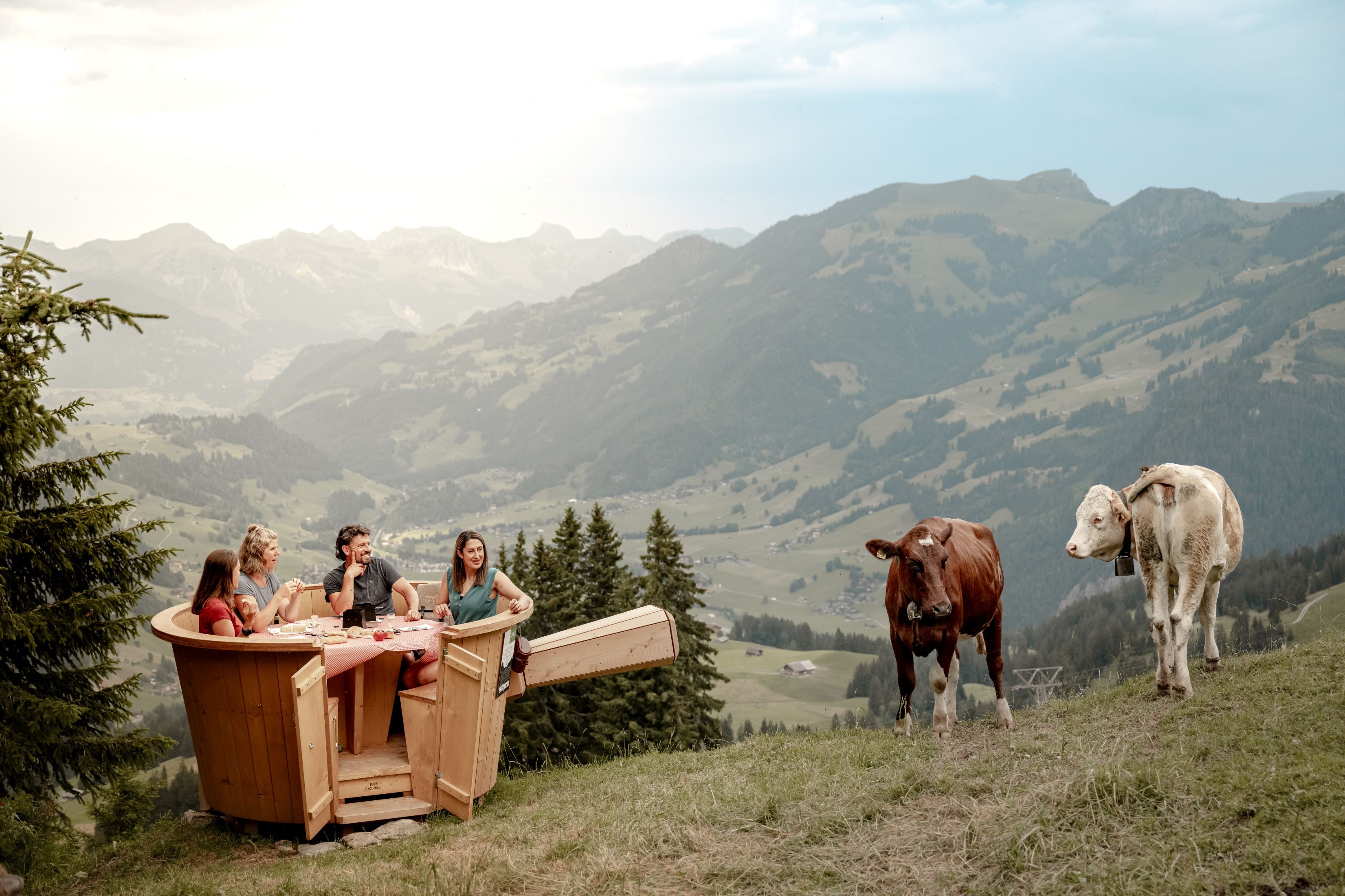 Mit einem gefüllten Rucksack der Molkerei vom Hotel zum riesigen Outdoor-Fonduecaquelon oder Hüttli wandern – zur Auswahl stehen im Tal verteilt acht überdimensionale Caquelons und zwei gemütliche Hütten. Käseliebhaber:innen geniessen hier inmitten der Natur gesellige Fondue-Momente mit herrlichem Panorama.
