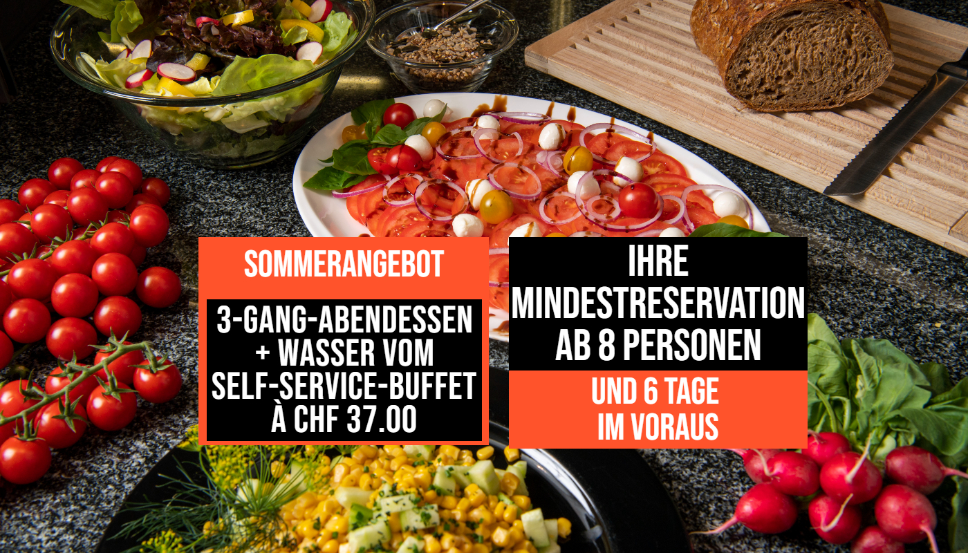 Möchten Sie das Sommer-Abendessen für Gruppen ab 8 Personen hier per Mail reservieren, bitte mindestens 6 Tage im voraus:→- im Sommer begrüsst Sie das Küchenteam herzlich im beliebten Self-Servicerestaurant um 19.00 Uhr, wo Sie am Buffet frische Salate, einen fixen Hauptgang und ein Dessert mit Wasser erhalten.